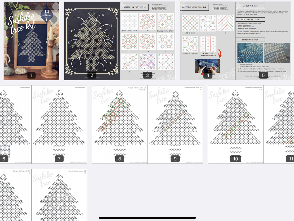 This sashiko tree consists of 14 hitomezashi sashiko patterns ( including 1 weaving sashiko pattern with a tutorial video). It will be a good hitomezashi sashiko sampler as well!